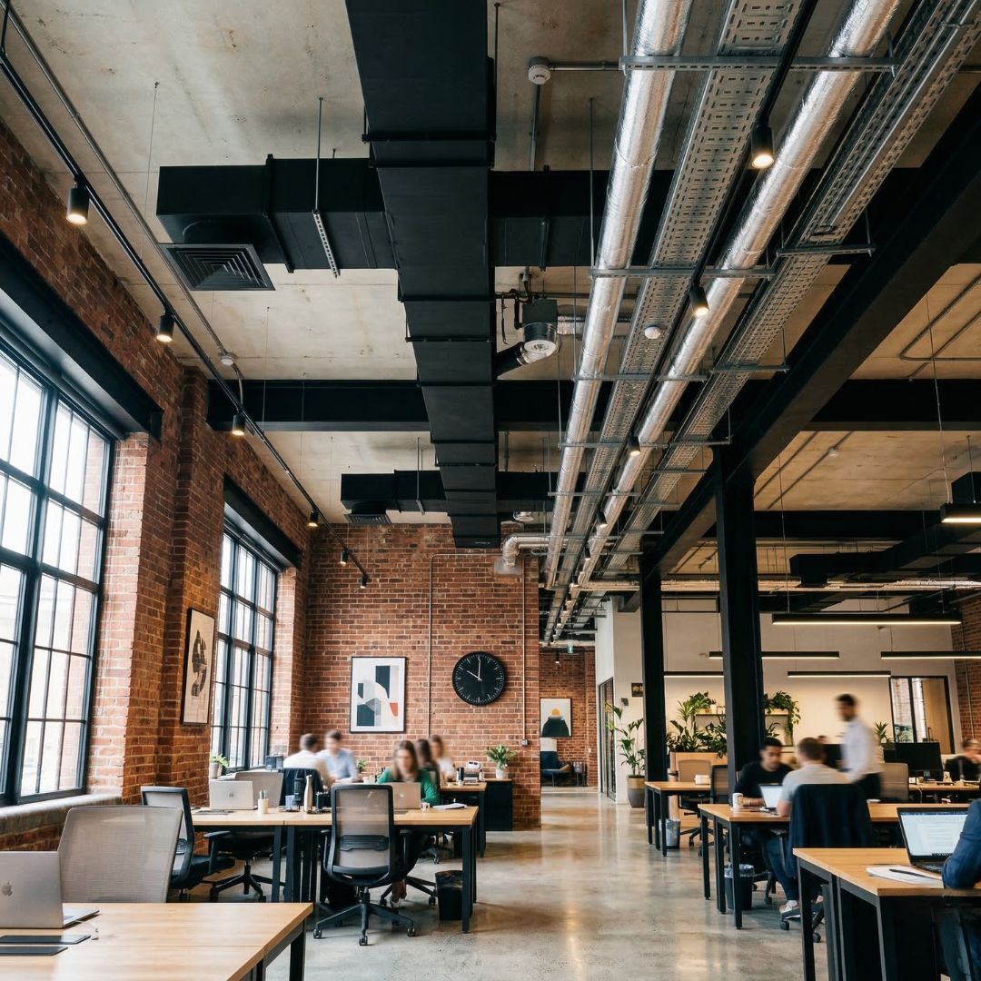One of our favorite design trends involves embracing the raw beauty of industrial architecture. By intentionally leaving ducting, piping, and structural beams exposed, we provide North Carolina offices with a sophisticated, modern edge. This "industrial vibe" combines high-end finishes with rugged textures, offering a unique visual contrast that signals a forward-thinking and highly creative brand identity.